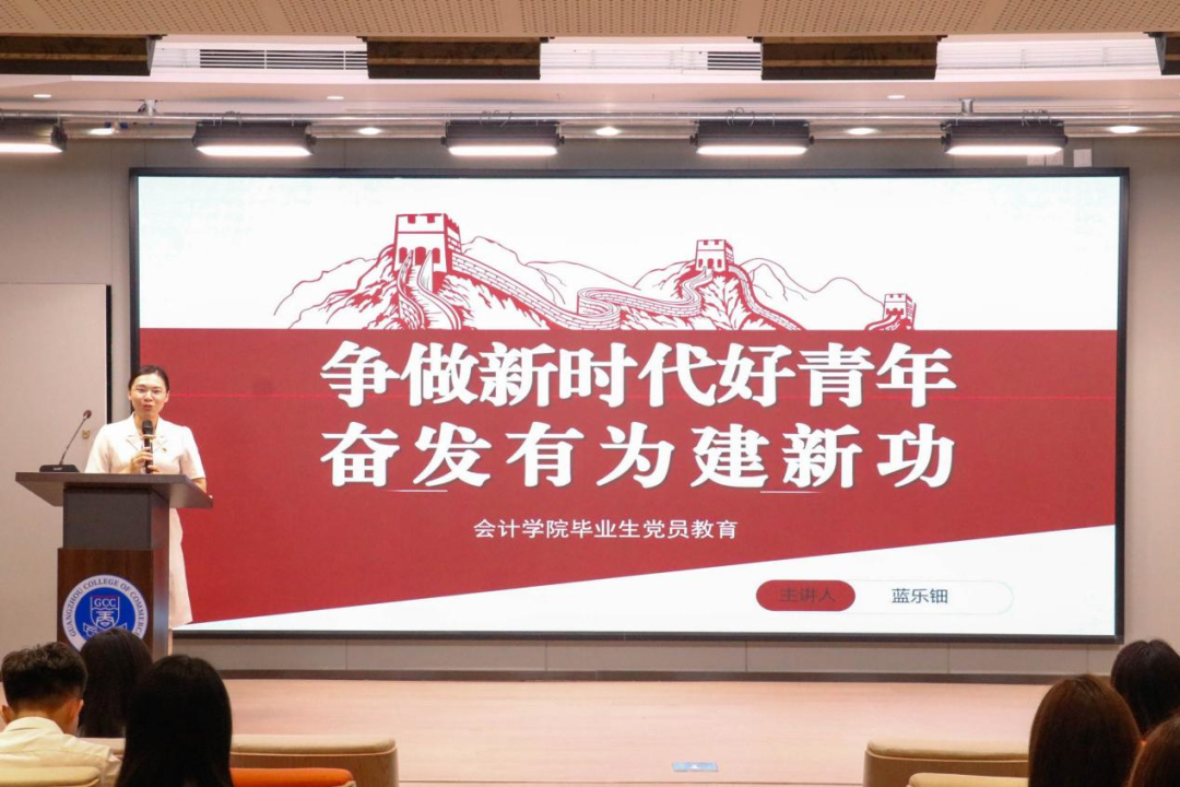 争做新时代好青年,奋发有为建新功。蓝乐钿以此为题,围绕谈理想、谈担当、谈爱国、谈人生、谈成长五个方面内容为全体毕业生党员讲授一场意义深刻的专题党课。她希望大家能尽快从学生角色转入职场人角色,铭记入党初心,铭记党员义务,在工作中多学多做,脚踏实地,“自找苦吃”,在岗位中发挥青年人的担当,在工作中绽放青春的色彩。