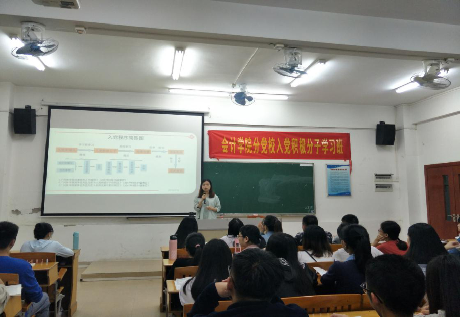 课上,廖秀娟用图文的方式向学员们详细地讲述入党程序、组织发展制度、中国共产党发展党员工作细则和广州商学院发展党员工作细则。她强调:作为入党积极分子,一是要坚持理想信念不动摇,加入党组织是一个漫长的过程,在这个过程中需要不断的努力,达到优秀的标准;二是要在日常的生活学习中,加强政治理论学习,以党员的标准严格要求自已;三是要自觉践行社会主义核心价值观,认真钻研专业知识,练就过硬的本领,在伟大的民族复兴之梦中书写美丽的人生华章。