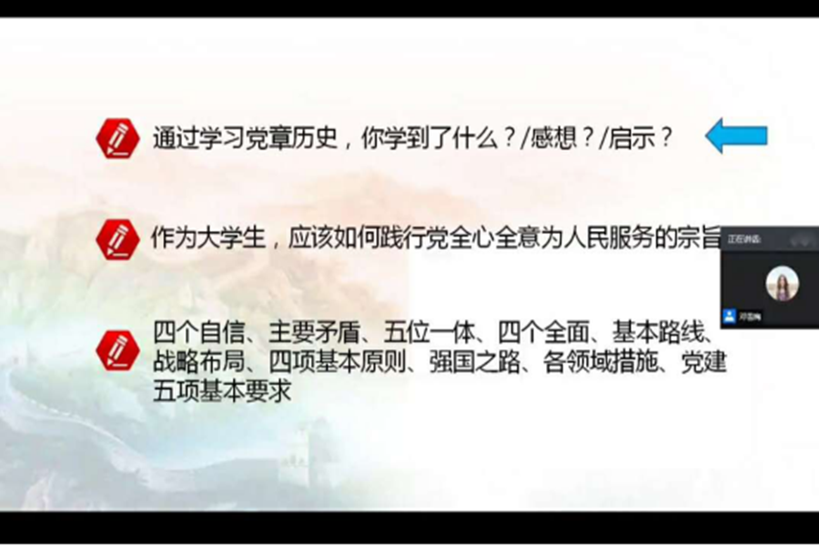 本次线上党课学习一共分为五部分,分别为党章的概述、党章的发展历程、党章总纲部分、交流讨论、课程总结。首先,邓雪梅书记向入党积极分子讲述了党章的定义、功能及定位、基本架构等,使各位同志有了初步的概念认识;其次,通过介绍中国共产党的发展过程,引出党章的发展历程,让入党积极分子了解了中国共产党的曲折发展,也体现了党对国家和人民负责的精神和宗旨,让同学们明确肩负的责任与担当。第三部分学习党章的总纲部分,邓雪梅对党的性质、宗旨、指导思想等内容进行详细的讲解,各位同志认真做好笔记。在交流讨论之时,各位入党积极分子都积极参与其中,阐述自己的观点和想法,深化对理论知识的学习。最后,党支部书记邓雪梅作总结,希望同学们自觉学习党章、遵循党章、维护党章,自觉加强党性修养,提高自身思想觉悟。同时向同学们推荐了党课学习的网站,并要求同学们认真学习领会。