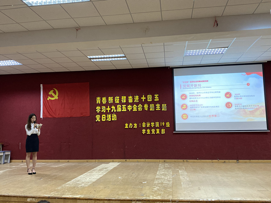 本次主题党日活动共分为四部分:微党课学习、小品展现新时代变化、答题环节、书记总结。活动伊始,全体人员起立奏唱国歌。首先,由钟淑芳同学给大家上微党课,她以PPT讲解和分析,带领我们从国力、经济、民生三方面对十三五经济发展成就进行回顾,我们感受着国家发展带给我们生活、工作、学习等各方面的变化;其次她通过视频《收获与梦想,我眼中的“十三五”和“十四五”》更直观地让我们体会普通老百姓眼中过去5年中国的发展,遥想畅谈未来5年的中国。第二部分是以小品的形式展现新时代变化,由罗文涓、李婉、黄伟绵等5名同学带来小品《支付改变生活,我与未来对话》,科技改变生活,在小品中,我们看到了支付方式的改变给我们生活带来的便利,给商家们带来更多的发展机会,这正是我们科技发展带来的优势,最后小品呼吁:我们不能满足于现状,我们要创造更好的2035,相约在2035的欢呼雀跃之中。活动第三部分为答题环节,题目紧扣十九届五中全会的背景和方针,有效加深了同学们对“十四五”内容和精神的了解。