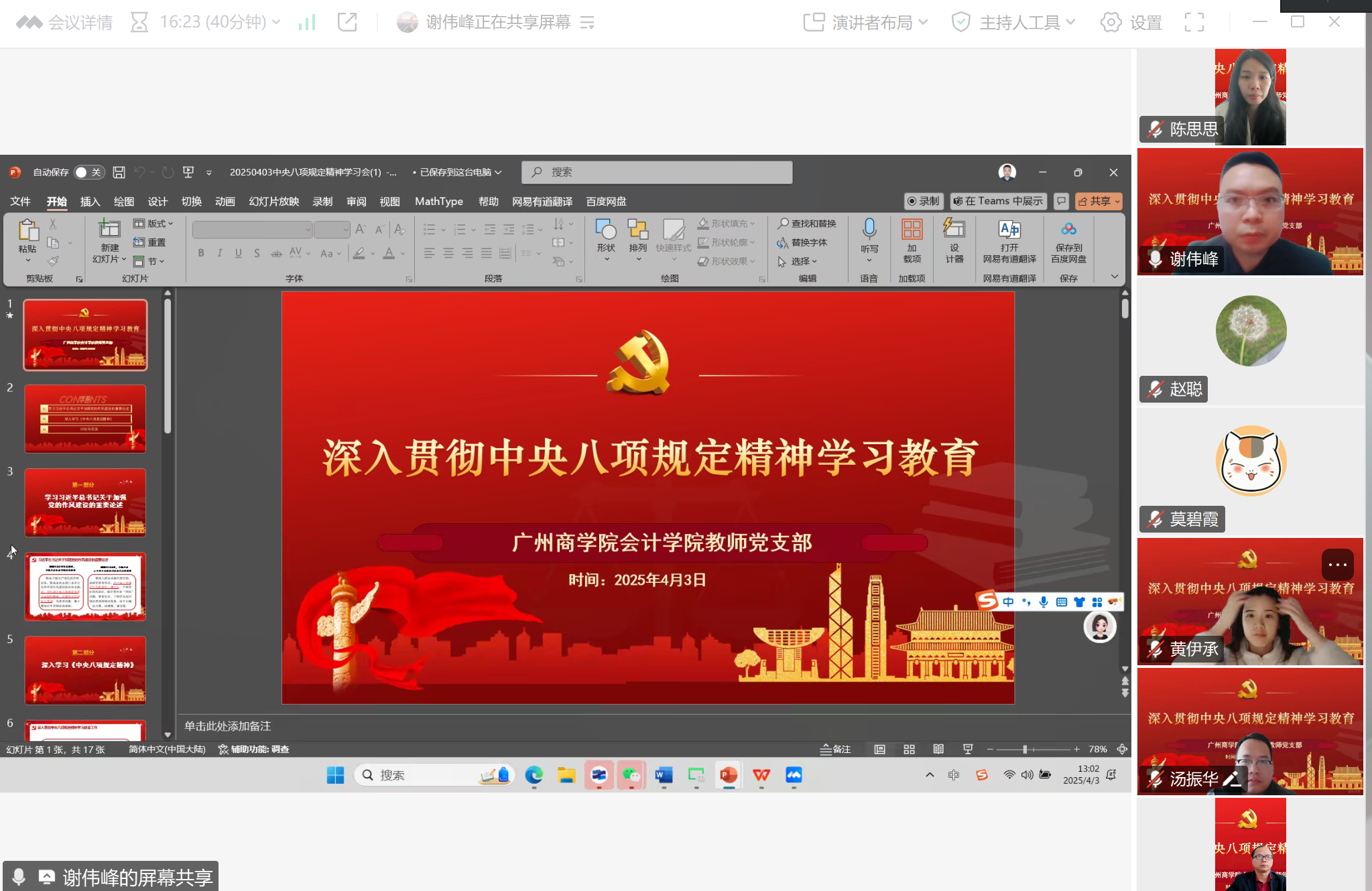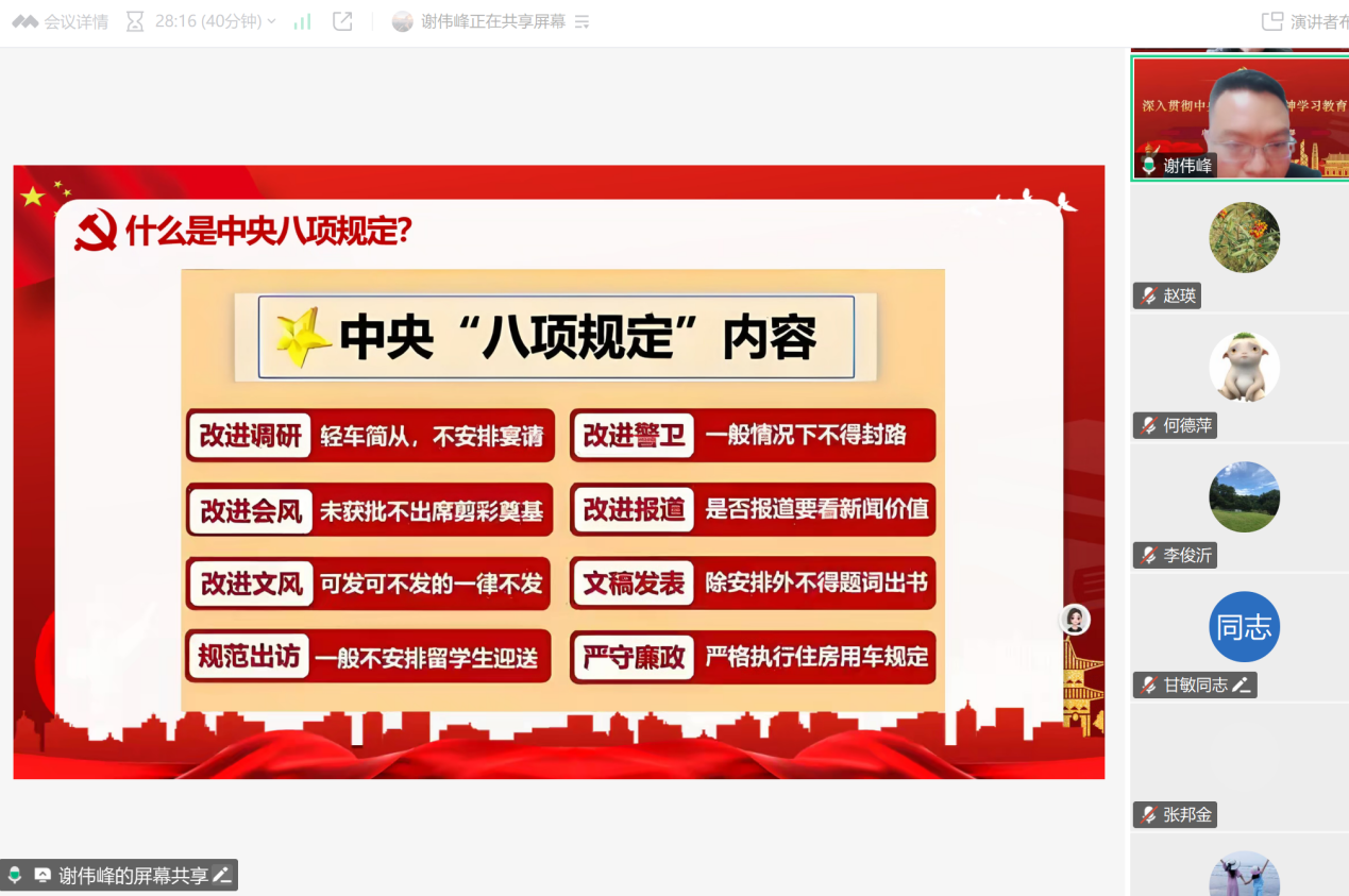 2025年4月3日,久久久免费教师党支部织开展深入贯彻中央八项规定精神学习教育,旨在强化党员教师的纪律意识,确保党中央各项决策部署在教育领域落地生根。本次学习教育由党支部书记谢伟峰主持,全体党员教师参加了学习。