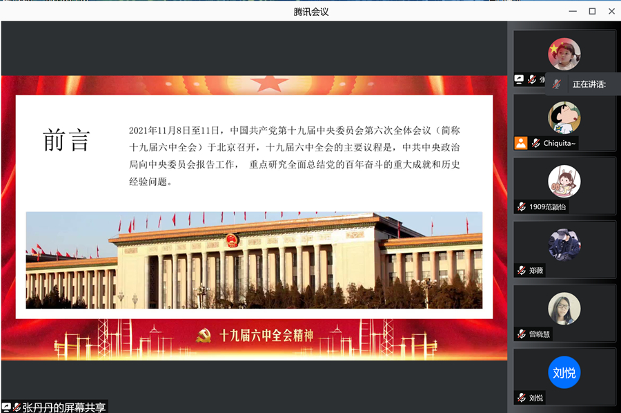 为深入学习贯彻党的十九届六中全会精神,走好实现第二个百年奋斗目标新的赶考之路,久久久免费2019级学生党支部于12月28日在腾讯会议开展“回首百年奋斗路,开创时代新征程”专题党课,集中学习十九届六中全会精神。党课有支部书记邓雪梅主讲,全体支部党员均参与党课学习。