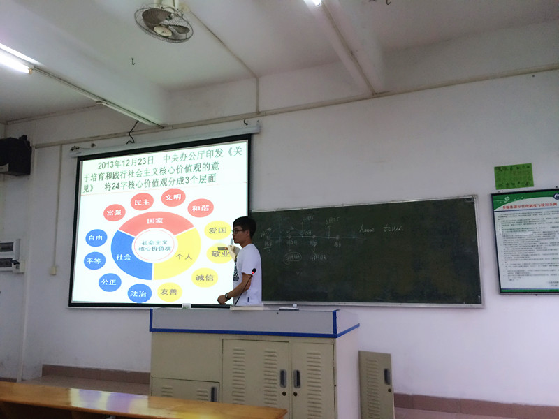 本次的微党课以“践行社会主义核心价值观,当一名优秀的大学生”为主题,以“党的十八大提出的贯彻社会主义核心价值体系的最新概括:‘三个倡导’24字”为主线,提倡同学们从自身做起,做好自己才能为社会作贡献,实现自己的价值。