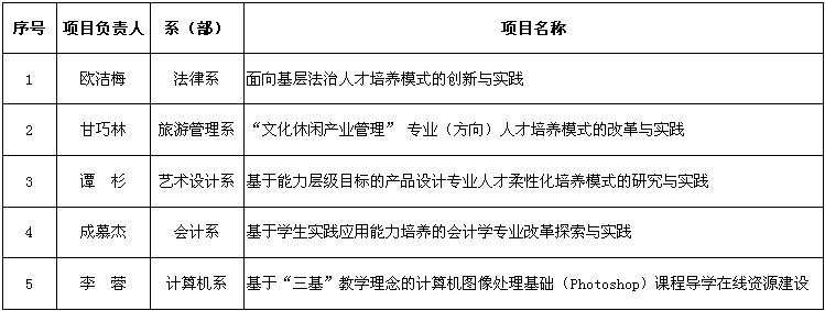 为切实做好我系教育教学成果奖培育工作,进一步加大教学改革力度,按照《广东省教育厅关于做好广东教育教学成果奖(高等教育)培育项目建设工作的通知》(粤教高函〔2014〕172号)安排,去年在学院组织下,我系积极开展了广东教育教学成果奖培育项目申报工作。根据近日广东省教育厅发布的《广东省教育厅关于公布2014年度广东教育教学成果奖(高等教育)培育项目的通知》(粤教高函〔2015〕72号)文件,我院共有5个项目获得广东教育教学成果奖培育项目立项,其中有我系成慕杰教授的《基于学生实践应用能力培养的会计学专业改革探索与实践》。具体名单详见下表: