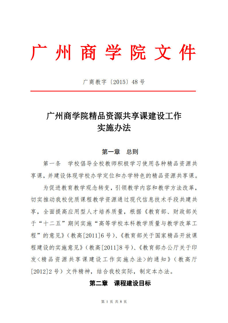 广商教字〔2015〕48号 广州商学院精品资源共享课建设工作实施办法