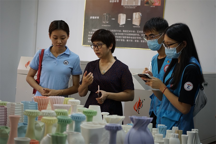 明如镜,声如磬的潮汕陶瓷,在经过世代相传的演变之后,形成了独具一方的新彩绘品种。广东省陶瓷研究院刘絮飞主任带领服务团参观时介绍,潮瓷一直坚守匠心,在工艺创新方面采用了3D打印技术,完成了潮汕陶瓷业的产业变革。陶瓷研究院刘絮飞主任强调,新时代青年要领悟到有责任与义务去保护非遗文化,投身到传承非遗文化,共同构筑起中华民族非遗文化的桥梁。