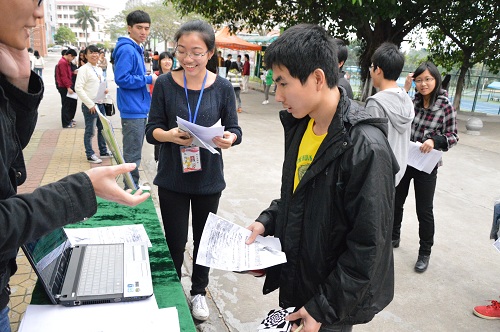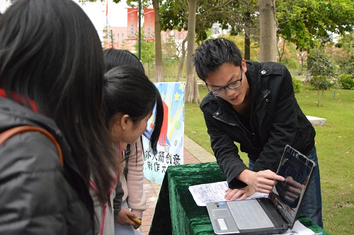 丝丝凉风下,绿色帷幕上的宣传画与水火箭海报吸引着路过的学子驻足观看;干事们热情地向同学们介绍比赛,加深同学的兴趣;还有工作人员在摊位上播放视频,让前来的同学进一步了解比赛的准备工作。宣传工作,如火如荼地开展着。