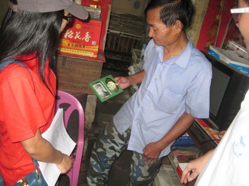 我们的队员到达退伍军人钟观成爷爷家。钟爷爷的屋子比较简陋,家中只有一部老电视机和一台风扇,但爷爷依然保持乐观、开朗的生活态度。见我们的到来爷爷显得格外开心,热情地向讲述他年轻时的参军历史。我们三下乡队员们用客家话与爷爷交流,慰问老人家平时的身体状况,爷爷脸上洋溢出幸福的微笑。我们还带来了电饭煲、电热水壶和汤锅赠给钟爷爷,献上我们一片小小心意。随后三下乡队员还走访了四户五保户,将家电等送到老人手中,送上我们浓浓的情意。