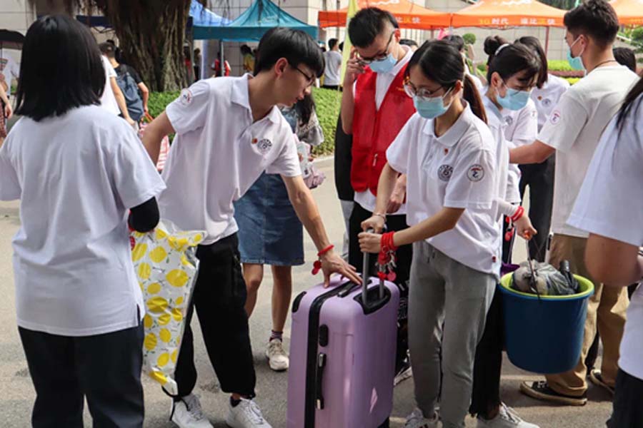 活动现场,会院师生党员们活跃在迎新现场的各个角落,为新生们提供真诚服务。一张张热情的笑脸、一句句亲切的问候以及一项项贴心的迎新服务欢迎来自祖国各地的莘莘学子们,让新生学子们充分感受到家一般的温暖与热情。从校门口到报道处再到学生宿舍,党员同志们积极主动为前来报到的新生进行报到引导,提供相关咨询。同时,学院教工党员也在党员志愿服务岗,为会院新生解析专业前景、奖助贷政策等,引导新生应该好好利用大学时间,不断充实自己、完善自己。