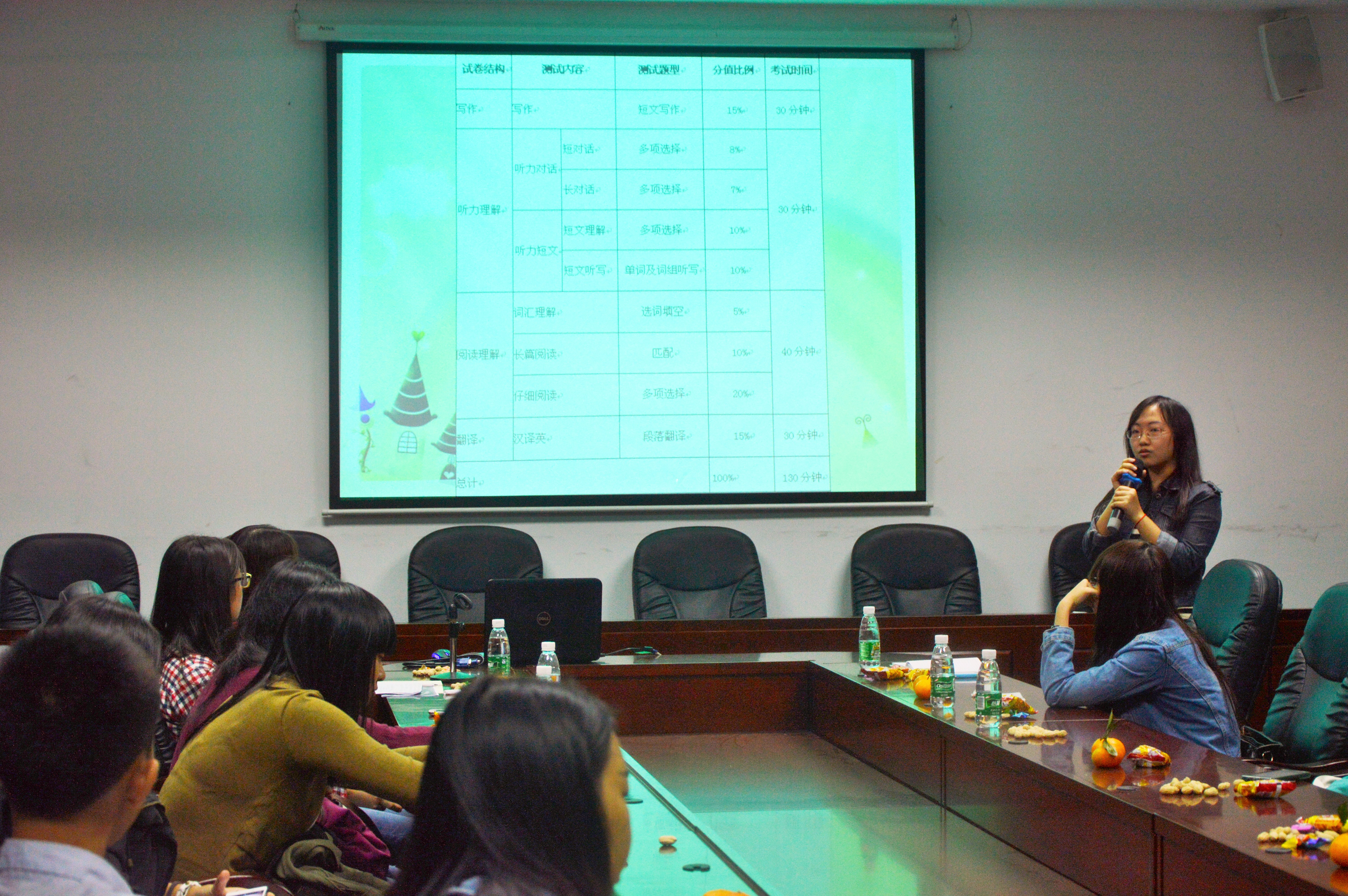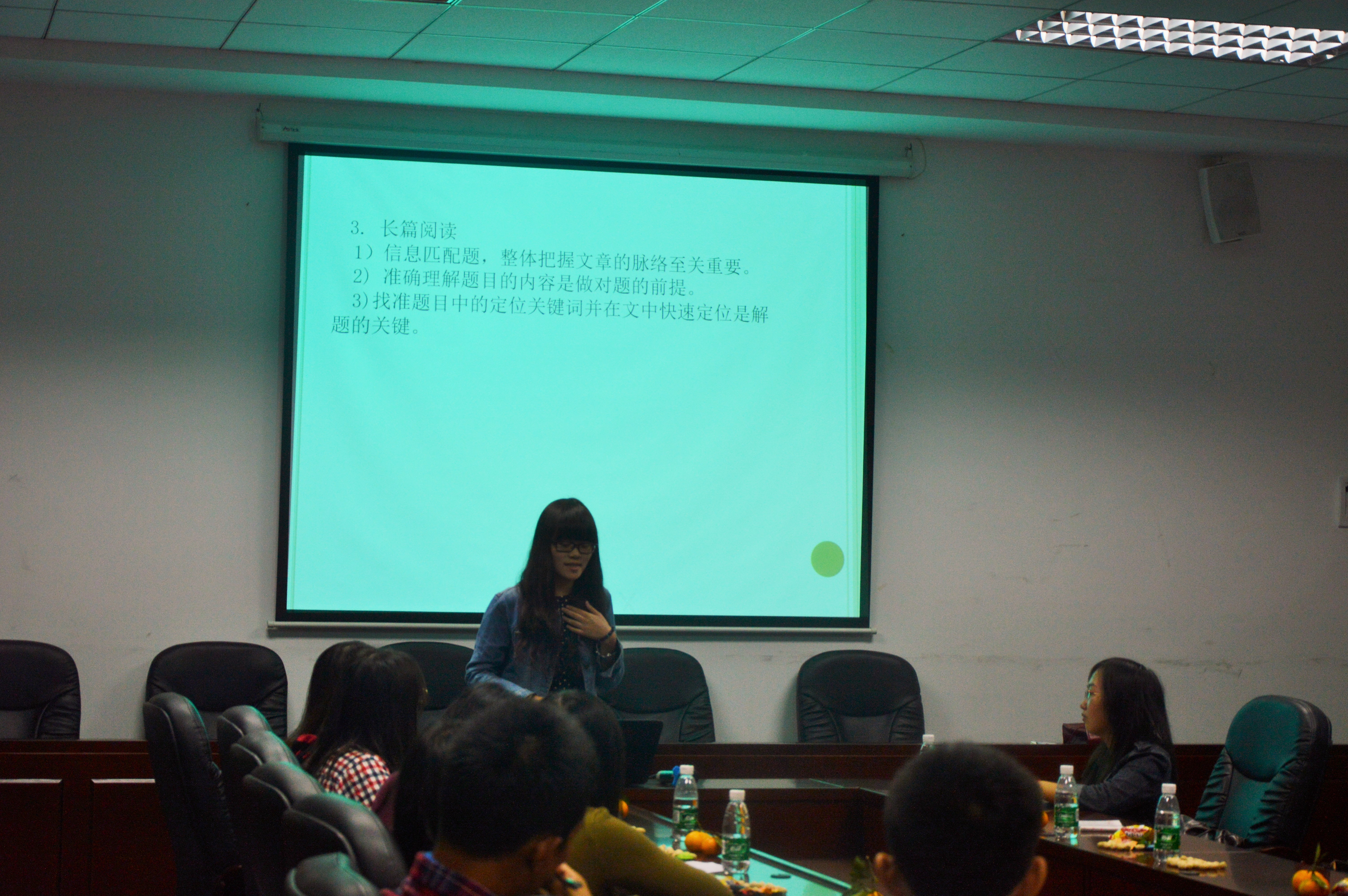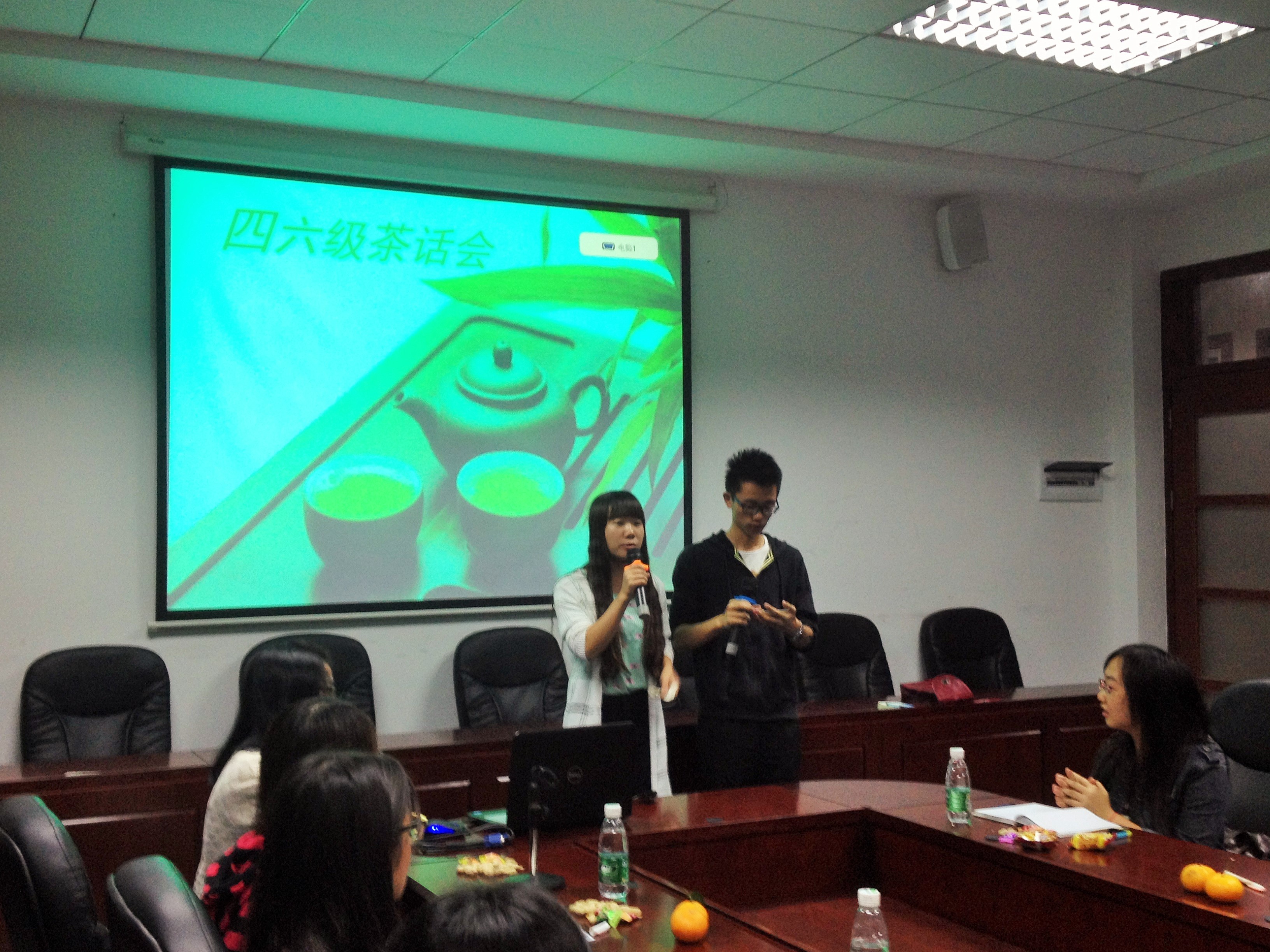 为提高同学们英语四六级考试通过率,促进学生间英语学习的交流,会计系团委于2014年11月6日晚6点半在第二行政楼308举行特色茶话会之四六级专题。本次茶话会由会计系团委副秘书长徐秋怡与吴鸿滨共同主持,主讲人为11级罗清华和12级陈思杏、王晓静、丁青青等多位高分通过四六级的高年级学生。