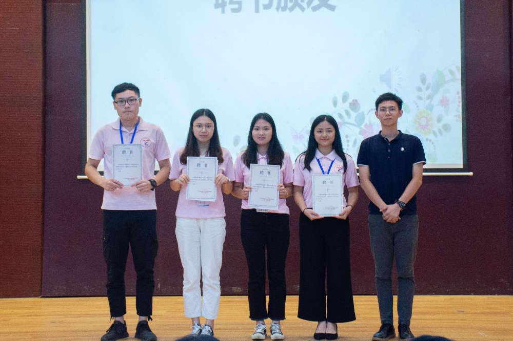 总结完毕后,由张振华宣读2018-2019学年度学生会工作中表现突出、工作积极的优秀部门及优秀个人。经学生会日常考核决定授予宣传部、自律委员会、网络部、生活部优秀部门称号,对陈傲宇等21名干部进行表彰,由廖秀娟为他们颁奖。最后步入本次会议的最后一个环节,颁发聘书。聘书,是学生干部在学生会一年来中辛勤工作的证明,也是对其能力的肯定,由张振华老师为每位部长及干部颁发聘书、合影留念。