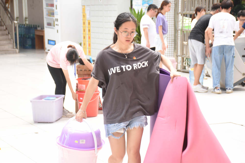 在开始搬宿舍之前,学生公寓前便早已聚集几十名志愿者,在各老师对志愿者的简单分配任务后,紧张的搬迁工作开始了,有的负责指挥,有的负责装卸,有的负责派水。参与运输的两辆车在8栋与30栋之间装、卸学生的行李。虽然在搬运的过程中突然下起大雨,但大家仍然井然有序,无所畏惧,照样冒着大雨毫无顾忌地去搬运行李,半刻也不松懈。