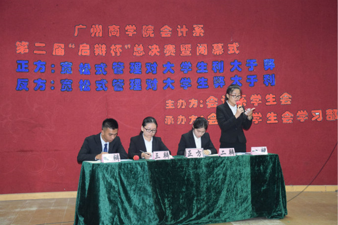 纸上得来终觉浅,绝知此事要躬行。大学不仅注重专业知识的教学,更看重学生实践能力的培养。为了给学子提供展示自我、锻炼自我、提升自我的舞台,打造一个交流思想、锻炼思维、学以致用的广阔平台。11月15日晚上,会计系学生会在A206举办了第二届“启辩杯”总决赛暨闭幕式,莅临本次辩论赛的嘉宾有会计系学生会指导老师吴梦、校学生会主席、会计系学生会主席团、及各院系辩论队队长。