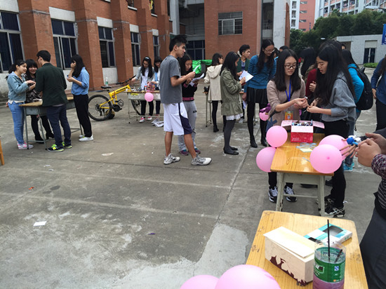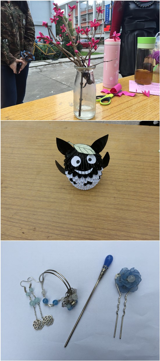 手工制作大赛由会计系学生会辩论队副队长谢璧联主持。比赛现场激烈且井然有序。参赛选手蓄势待发,待主持人一声令下,便争分夺秒地制作作品,作品题材丰富、趣味多样。一整排精致的手镯和发簪吸引了观众的眼球;栩栩如生的纸质小猫也毫不逊色,引得买家争先恐后地买作品;逼真的梅花赢得了评委的一致好评。在比赛中,巫欣等同学通过精心的制作荣获比赛一等奖;叶炜坤等同学荣获二等奖;陈凯茜等同学获得三等奖:刘雪娇、罗佳婧等同学分别获得积极奖和优胜奖。