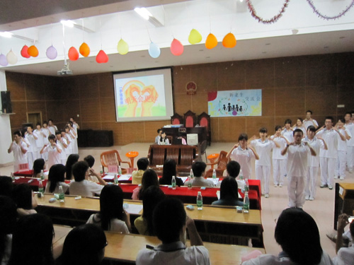 交流会伊始,团委组织部部长简莹文师姐言简意赅地宣布新生团员教育系列活动正式启动。交流会以“重温与教官的美好回忆”作为第一环节,精彩的视频内容唤起新生对军训生活的丝丝怀念,听着优美的背景音乐,新生仿佛又回到了军训现场。视频过后,10级辅导员陈秀纯老师介绍自身经历,以“大学是梦腾飞的地方”、“大学是个小社会”、“学会做人”三点引导新生适应大学生活,做好大学生涯规划。接着,一段简短有趣的小品表演引出新老生交流会的目的,交流会正式开始。