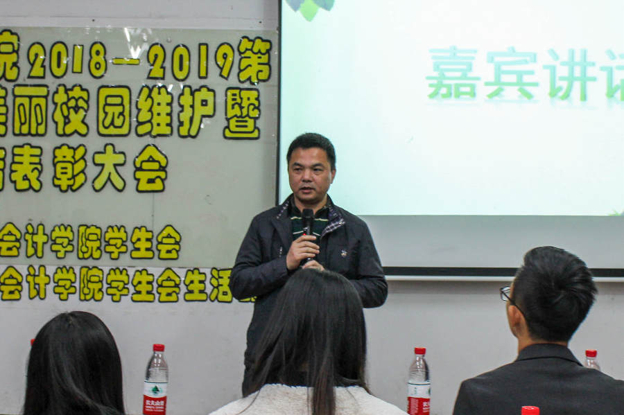 钟远辉在总结发言时首先代表学院领导对学生干部和同学们付出的辛勤劳动表示感谢,对获得荣誉的先进集体和个人表示祝贺,并对今后的工作提出三点希望,一是要提高思想、统一认识,希望同学们认识到维护校园环境的重要性;二是分工明确、加强团队协作精神,希望同学们在维护校园环境中加强沟通,并对卫生工作做出合理的安排;三是持续发力、久久为功,希望同学们把营造美丽校园环境工作与“文明、修养、形象”主题教育活动紧密结合在一起,加强个人的自身修养,养成爱校、护校的行为习惯,为建设美丽广商出一份力。