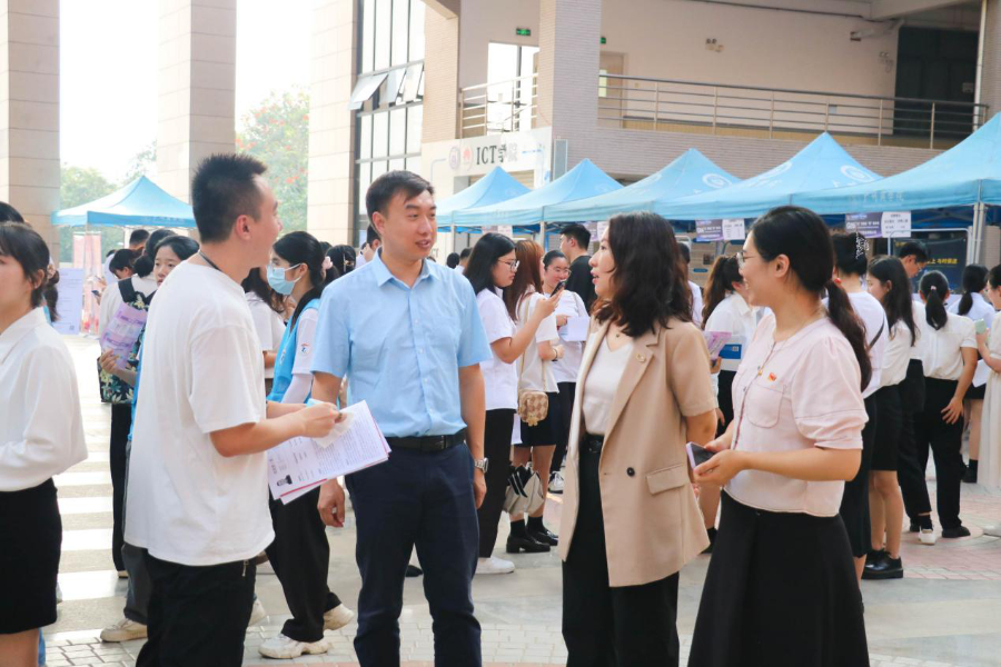 在招聘会现场,求职者携带个人简历、荣誉证书等求职材料与用人单位就单位概况、招聘需求、薪资待遇、职业发展前景等方面进行深入交流。用人单位招聘人员耐心地介绍企业情况。现场老师为求职者提供面试指导、政策咨询和精准招聘服务,现场气氛热烈,井然有序。同时,许多低年级学生也来到招聘会现场,感受招聘氛围,学习面试技巧,为今后的职业规划做准备。