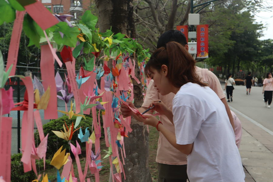 本次活动采用线上与线下同步、学习与竞答共促的模式开展,形式多样,竞答难易适中。活动现场由三个场地组成,第一现场由数千只千纸鹤组成,千纸鹤上 附有校史知识、四史知识和评估知识,寄托着我校顺利通过合格评估、庆祝建党百年的美好祝愿。第二现场则有数量难度不等的竞答知识红包,参赛学生通过掷骰子的方式抽取题目并回答,将娱乐与学习相结合,实现寓教于乐的目的。第三现场则依托广州商学院第十一期学生创业街活动,在学生设立的摊位处悬挂竞答问题,既丰富了竞答的形式,又为商家带去流量。此外,本次活动还在线上设立互动环节,学生通过留言的方式表明了“迎评在我心中,学习我在行动”的决心,展现了主人翁精神。