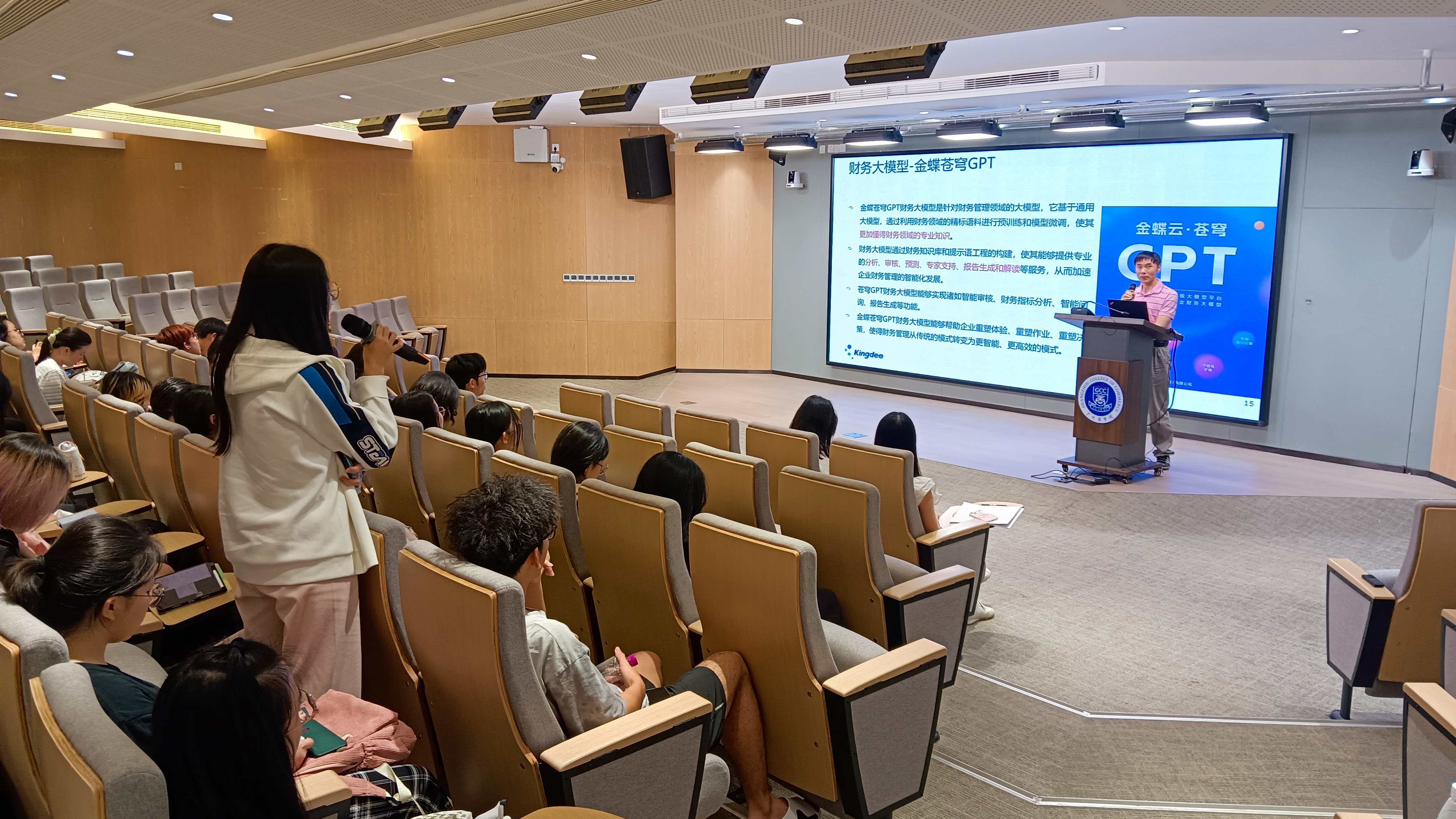 傅博士在讲座中首先从财务大模型的基本概念入手,对大模型和小模型进行了区分,傅博士还通过具体的例子,如大型模型在智能驾驶、医疗图像识别、气象预测等领域的应用,向学生生动展示了大型模型的实际应用场景,特别谈到了金蝶财务大模型以及苍穹GPT在财务领域的应用和发展,展现了大模型在处理大规模数据、提升模型挖掘能力和解决复杂问题方面的优势。这种形式生动直观,激发了学生们对财务大模型的兴趣和探索欲望。