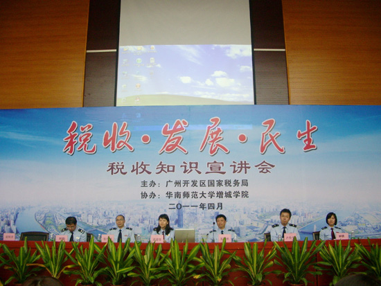 税收与会计密切相关。4月13日下午,广州开发区国家税务局应邀到我院学术报告厅作主题为“税收,发展,民生”的税收知识宣讲会。开发区国税局征管处吴天明处长、卢华宇副主任、钟轶副科长,第五分局梁碧华副局长、张作雄副局长,我院会计系主任助理凌辉贤副教授、党总支李锦堂书记参加了宣讲会。宣讲会由凌辉贤副教授主持,国税局叶聪先生主讲。