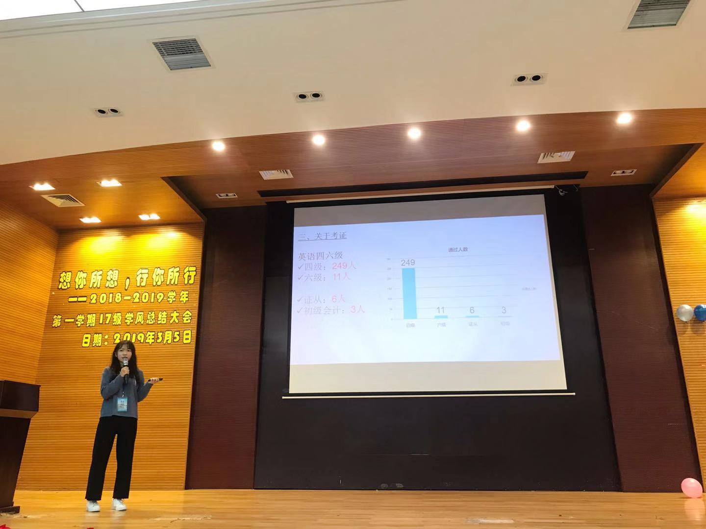 最后,廖秀娟老师对本次大会进行总结。她指出每一次年级学风总结大会都是大家学习交流学习的时刻,要互相学习,取长补短。并提醒同学们要各种机会,积极参与到各类竞赛中来,在实践中锻炼自己,抓住本次初级、四、六级考试前两个多月的时间,认真复习准备,争取早日通过。