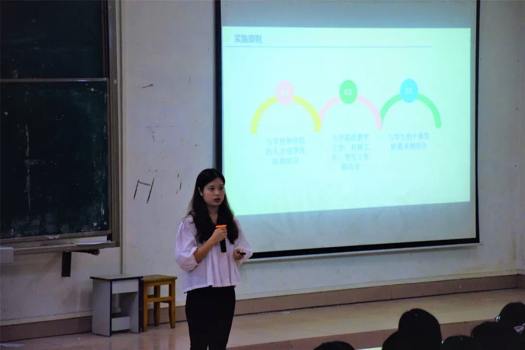 廖秀娟主要从“4+X”的定义,实施的原则,实施内容以及认定程序四个方面进行讲解。她指出,“4+X”可简单理解为学生素质培养,通过参加院校举办的活动、竞赛、担任学生干部以及在寒暑假参加社会实践等方式来促进学生综合素质的提高,增强学生的核心竞争力。该方案在实施过程中以与学校、学院的人才培养目标相结合,与学院的教学工作、科研工作、学生工作相结合,与学生的个体发展需求相结合为原则,要求学生通过参与寒暑假和学校日常社会实践志愿服务活动、各类教育讲座以及学院各种特色活动,获得一定学时。不同活动、以不同的身份参加所获得的学时不相同,学生也应当不局限于参与一种特色活动,应全面发展。这个过程不仅提高了学生的自身素质,增强了学生的核心竞争力,也让同学们亲身体验各类特色活动,丰富见识。