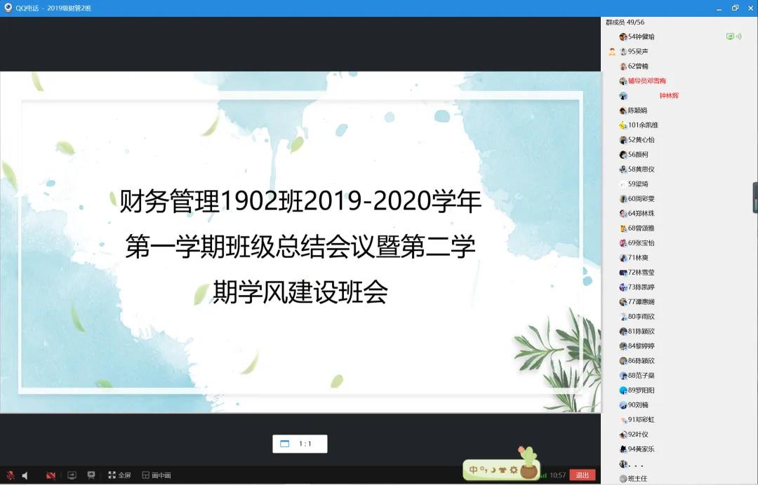 2020年是特殊的一年,因新冠肺炎疫情影响,2019-2020学年第二学期以线上方式开展网络教学。为了营造良好的学习氛围、培养年级学生艰苦奋斗的优良品质,久久久免费2019级于4月份以腾讯会议的形式召开一场“明确班级建设目标,巩固班级凝聚力”的主题云班,会议由班级班委主持,年级辅导员、班主任及全体同学参加会议。
