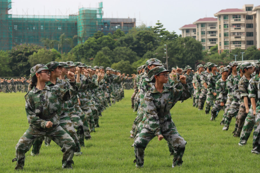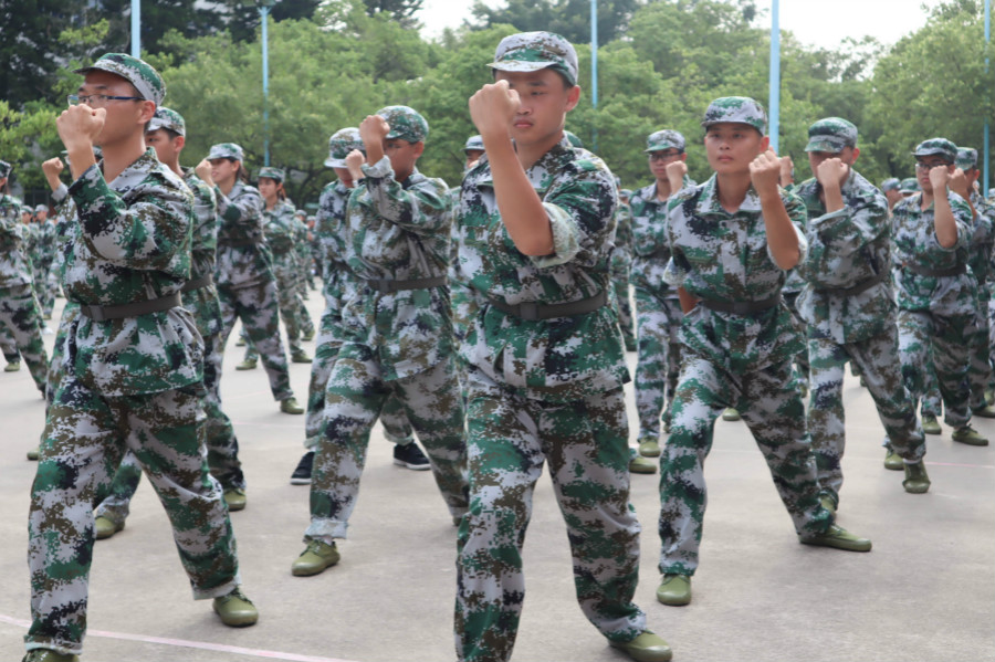 他们自信满怀,目光如炬,方阵严整肃穆,队列进退有序,阵前口号嘹亮,出一拳,吼一声,喊出了气势,喊出了精神!出拳、踢腿,一招一式有模有样,动作精炼,节奏分明,淋漓尽致地展现出了军人的风貌。他们动作齐整有力,举手投足间