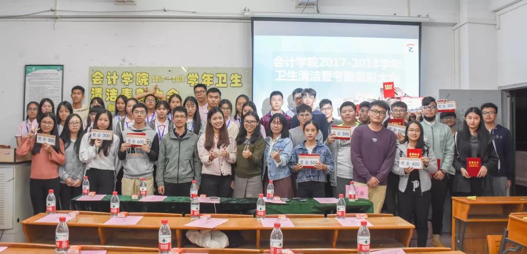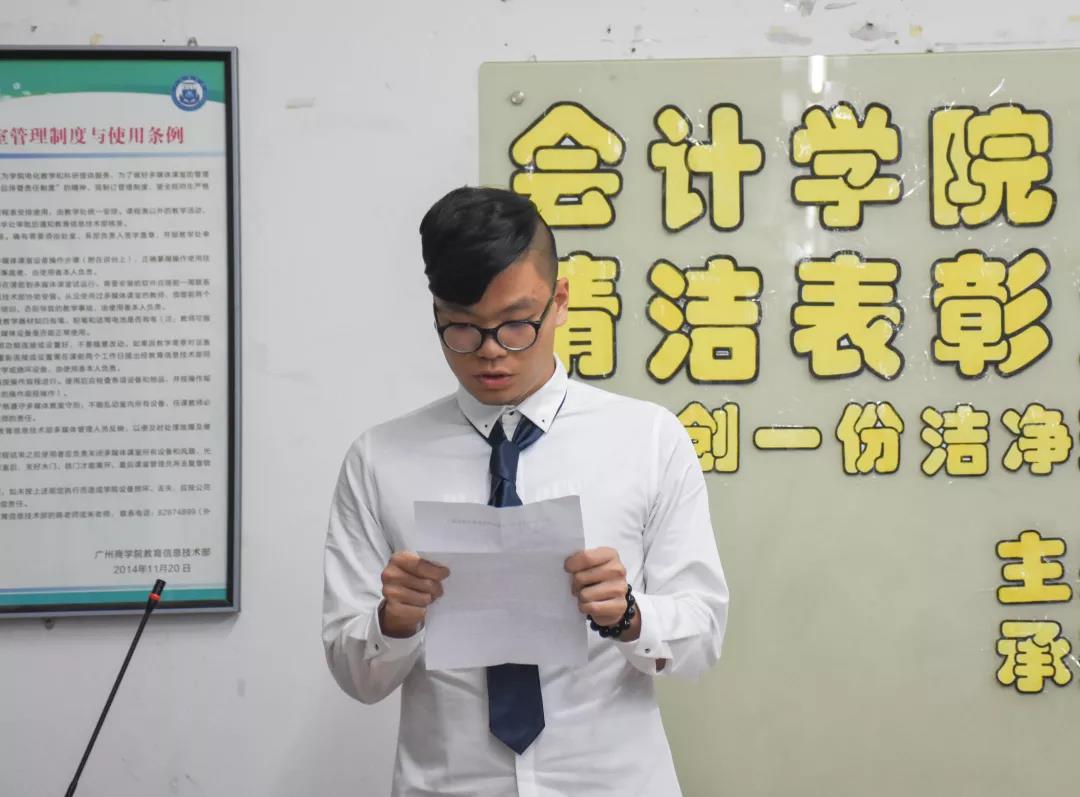 大会首向获得卫生清洁优秀班集体和优秀个人进行颁发荣誉证书及奖金。其中,获得一等奖的班级是17级财务管理1班,获得二等奖的班级有17级会计学1班、17级审计1班;获得三等奖的班级有 17级会计学5班、17级会计学6班,其余六个班级则获得优胜奖。而17级会计学2班杨嘉瑶、会计学3班李思灏、会计学5班邓泽军获得优秀实践委员的光荣称号。随后,李思灏作为代表作经验分享。他对于自己获得该奖项表示十分的激动,并对上年度的工作作总结。他认为学校的卫生清洁是由大家共同努力才能做好的,并且表明了要继续与班级共同努力,为校园卫生清洁贡献一份力。