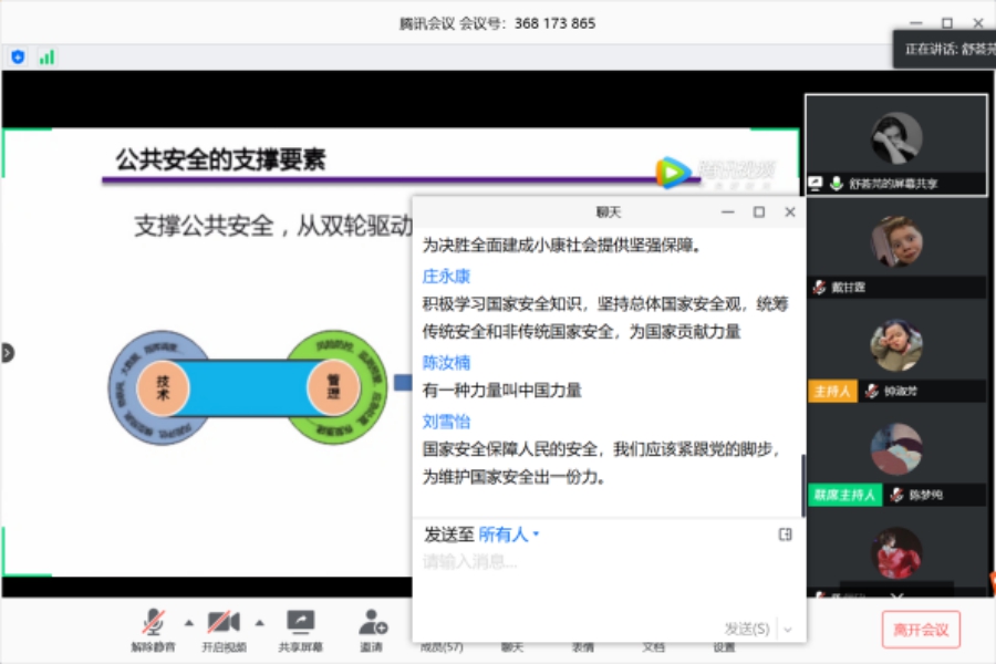 主题班会,形式内容多样。以QQ课堂、腾讯会议等直播软件为依托,各年级、各班开展以国家安全教育为主题的“云”班会。如:17级开展“坚持总体国家安全观,统筹传统安全和非传统安全,为决胜全面建成小康社会提供坚强保障”主题班会;18级通过“云”分享的方式,通过辅导员和学生相互分享的形式,引导学生牢固树立国家安全利益高于一切的观念。