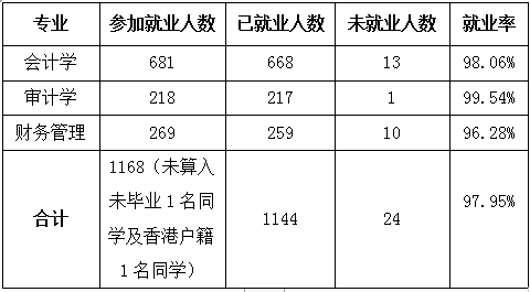 我院2019届毕业生参加就业人数为1168人,分布会计学、审计学、财务管理学3个专业,截止2018年9月1日,已就业人数为1144人,初次就业率97.95%,同比去年增长3.97%,其中,升学3人,出国11人,自主创业1人,参加三支一扶5人,参加西部计划3人,参加山区计划1人。