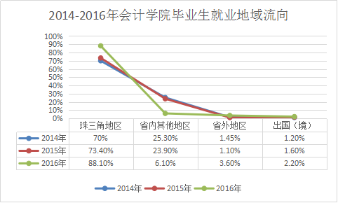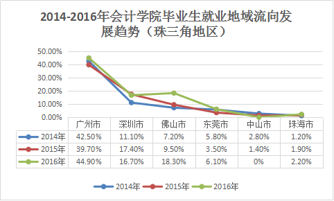 图1-4 2014-2016年会计学院毕业生就业地域流向发展趋势(珠三角地区)
